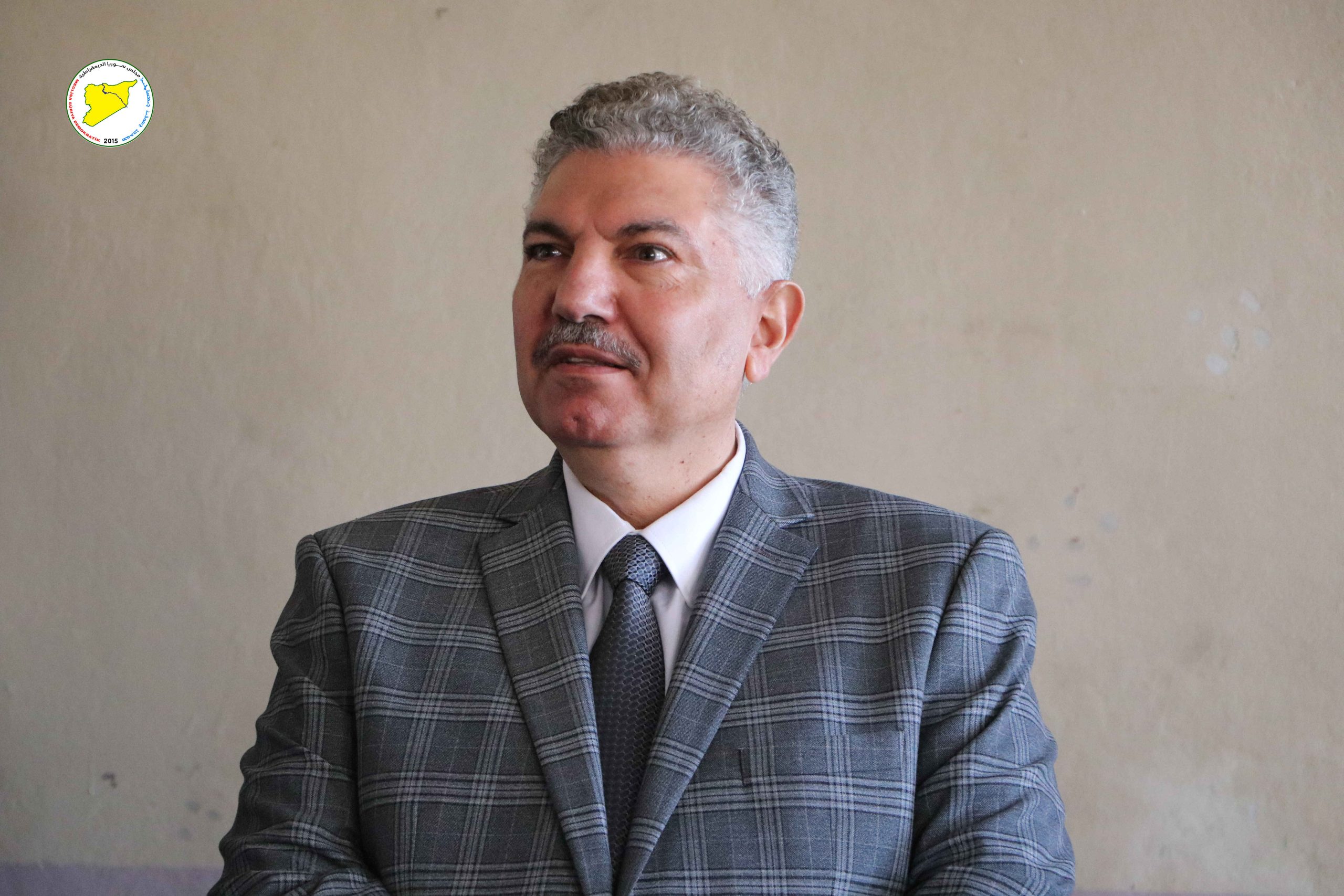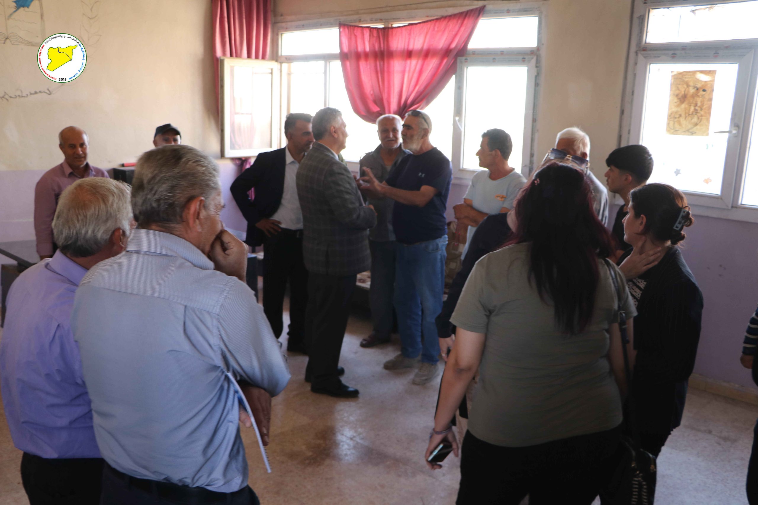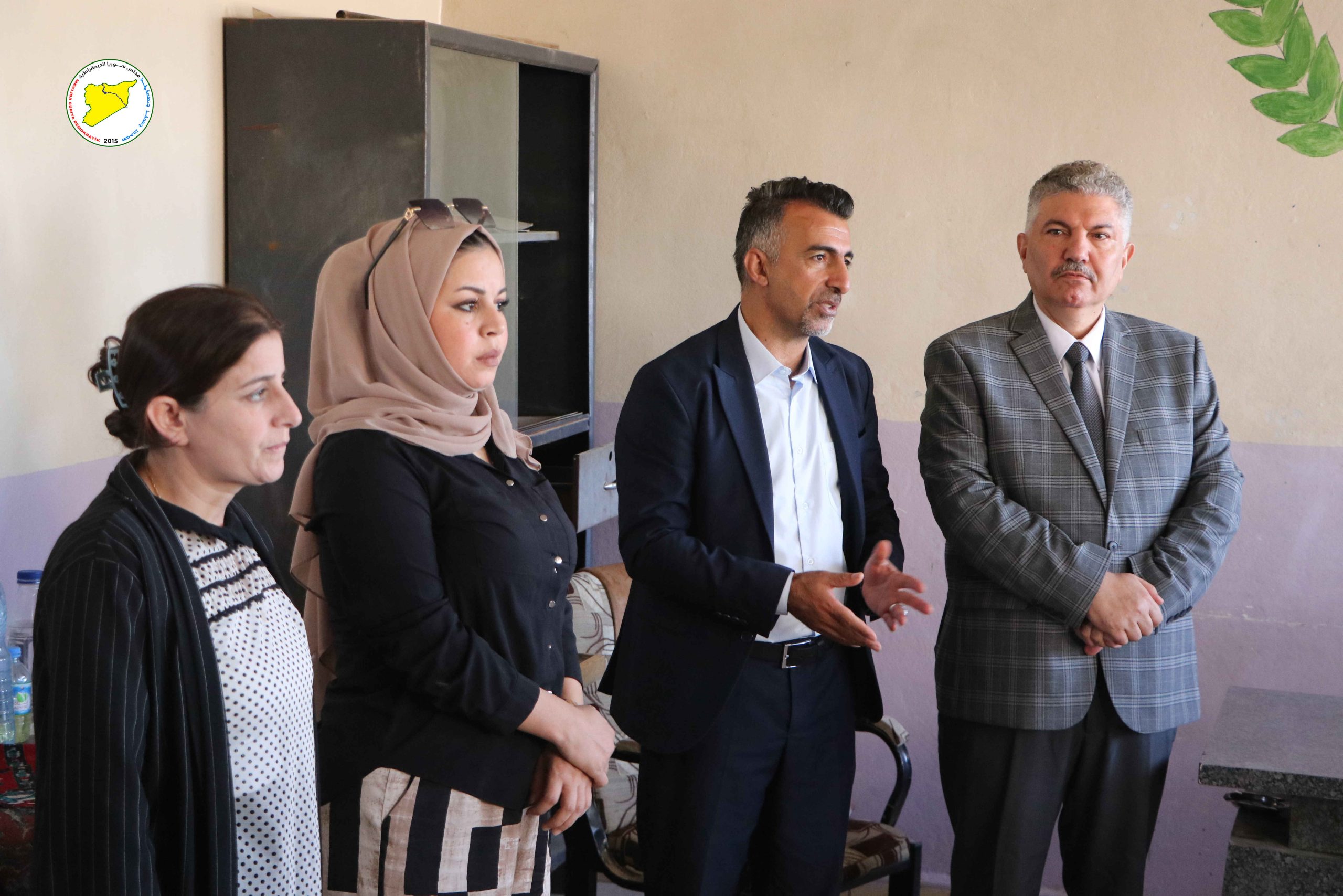 زار وفد من مجلس سوريا الديمقراطية، برئاسة الرئيس المشترك الدكتور محمود المسلط، عدداً من مهجّري عفرين والشهباء المقيمين في السكن الشبابي بحي النشوة بمدينة الحسكة، حيث أكد أن الحل الجذري لمعاناتهم يتمثل في عودتهم الآمنة إلى ديارهم وأراضيهم.