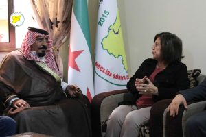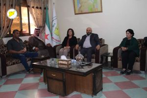 واستقبل الوفد كلٌّ من جيهان محمد، إدارية مركز مجلس سوريا الديمقراطية في حلب، وزينب قنبر، إدارية مكتب المرأة في المركز، ومحمد أمين، الإداري المشترك لمكتب العلاقات في “مسد” بحلب.