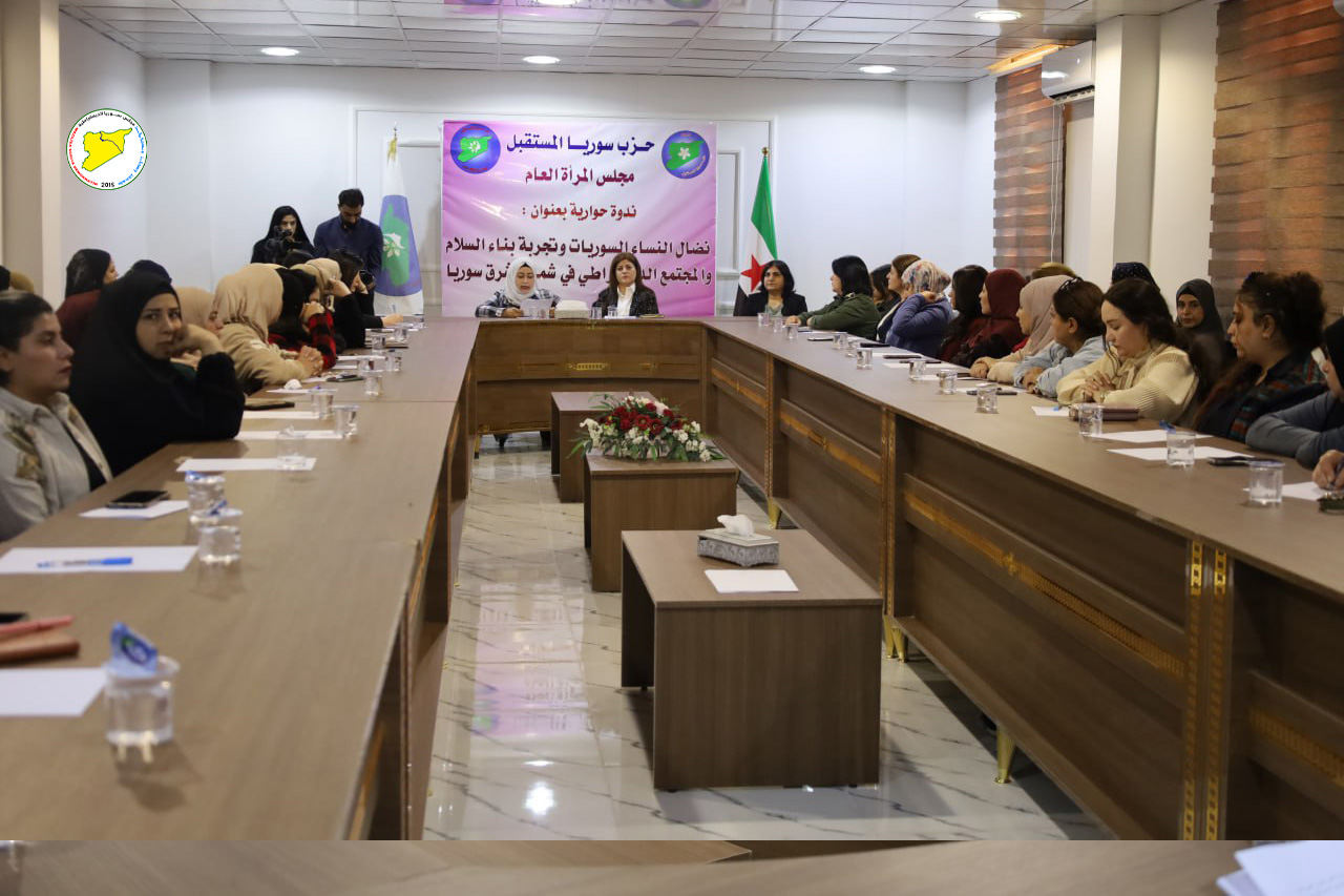 شارك وفدٌ من مكتب المرأة في مجلس سوريا الديمقراطية (مسد) في الندوة الحوارية التي نظمها مجلس المرأة العام في حزب سوريا المستقبل بالتنسيق مع مجلس المرأة السورية، تحت عنوان “نضال النساء السوريات وتجربة بناء السلام والمجتمع الديمقراطي في شمال وشرق سوريا”، وذلك في مقر مجلس المرأة السورية بمدينة الرقة.