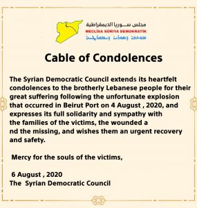 The Syrian Democratic Council extends its heartfelt condolences to the brotherly Lebanese people for their great suffering following the unfortunate explosion that occurred in Beirut Port on August 4, 2020, and...