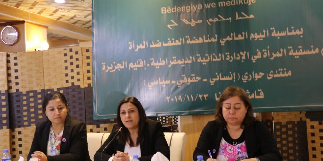 The Coordination of Women in Self-Administtation for North and East Syria ( SANES ) held a forum on violations and crimes committed by the Turkish state and its mercenaries against women in North and East Syria in Qamishlo today. Many women activities participated in the forum that included women organizations in the political parties, women offices in the administrative committees, in addition to participation of the co-chair of the Syrian Democratic Council, Amina Omar, and the co-chair of the organization office Laila Qahraman.The forum discussed several topics focused on Turkish violations and its crimes against women, where the first topic talked about The humanitarian side .The co-chair of Human Rights Organization in al-Jazeera district, Avin Joma’a, discovered the number of women exposed to the crimes of the Turkish occupation and its mercenaries. Whereas the second topic dealt with the legal aspect, which highlighted the international conventions that criminalize violence against women, the Convention of Elimination of all Forms of Discrimination against Women, the Turkish state violation all these conventions and its use for various types of criminality against women in north and east Syria. The third topic focused on political side, where the co-chair of SDC talked about the women, their role in the policy and their existence in decision- making centers in the world generally and in Syria especially. She also highlighted the practices of the Turkish state and its mercenaries against female politicians. Omar said that the assassination of the secretary general of the Future Syria Party, Hefreen Khalaf, should not pass without judging and bringing the criminals in front of international criminal courts. These events are part of a series of activities organized by women in north and east Syria on the occasion of the International Day against Violence against Women, which is on November 25th each year.