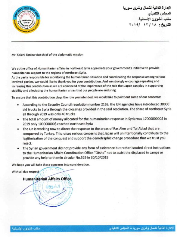 The Humanitarian Affairs Office of the Self-Administration for North and East Syria sent a letter to the Japanese government, expressing its thanks for its initiative in providing urgent aid to the regions of North and East Syria, and expressed its concern about the way of arrival of this aid.
