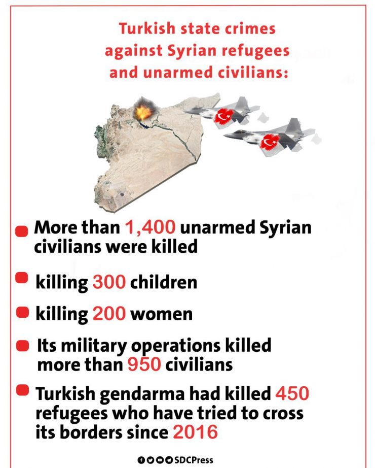 International human rights organizations have documented the human losses in Syria resulting from the bombing of Turkish forces and their aircraft to date in addition to the border guards, which amounted to more than 1,400 unarmed Syrian civilians, and among the dead were approximately 300 children and 200 women.
