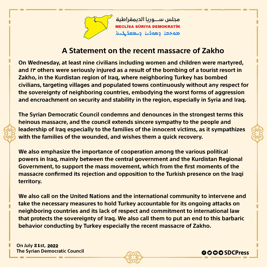 We also call on the United Nations and the international community to intervene and take the necessary measures to hold Turkey accountable for its ongoing attacks on neighboring countries and its lack of respect and commitment to international law that protects the sovereignty of Iraq. We also call them to put an end to this barbaric behavior conducting by Turkey especially the recent massacre of Zakho.