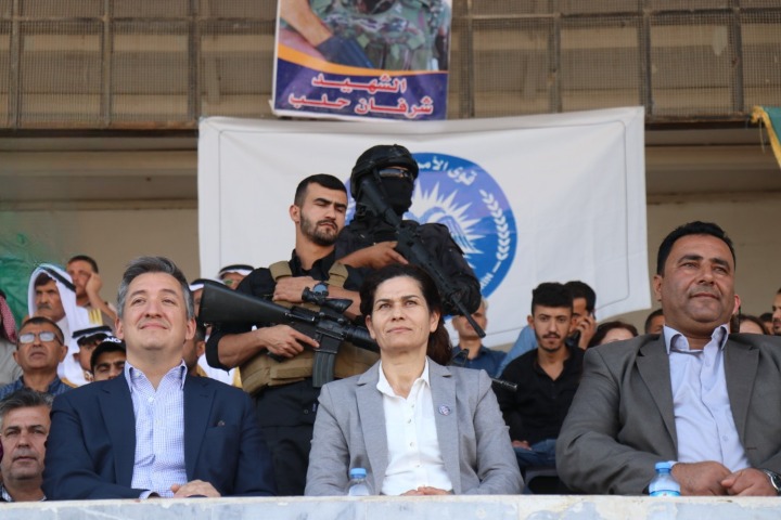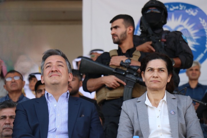 Ilham Ahmed, the Chairwoman of the Executive Body of the Syrian Democratic Council, and Nicholas Grainger, the Supreme Representative of the US government, in the presence of thousands of people participated in the celebration held by the people of Raqqa to commemorate the fifth anniversary of the liberation of their city from terrorism represented by the terrorist organization ISIS, which previously controlled the city.