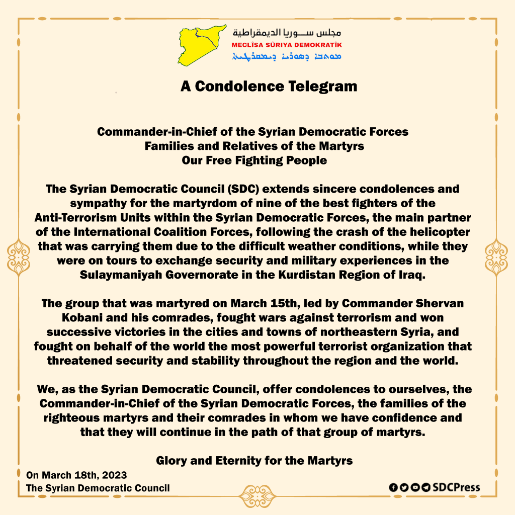 The Syrian Democratic Council (SDC) extends sincere condolences and sympathy for the martyrdom of nine of the best fighters of the Anti-Terrorism Units within the Syrian Democratic Forces, the main partner of the International Coalition Forces, following the crash of the helicopter that was carrying them due to the difficult weather #Shervan_Kobaniconditions, while they were on tours to exchange security and military experiences in the Sulaymaniyah Governorate in the Kurdistan Region of Iraq.