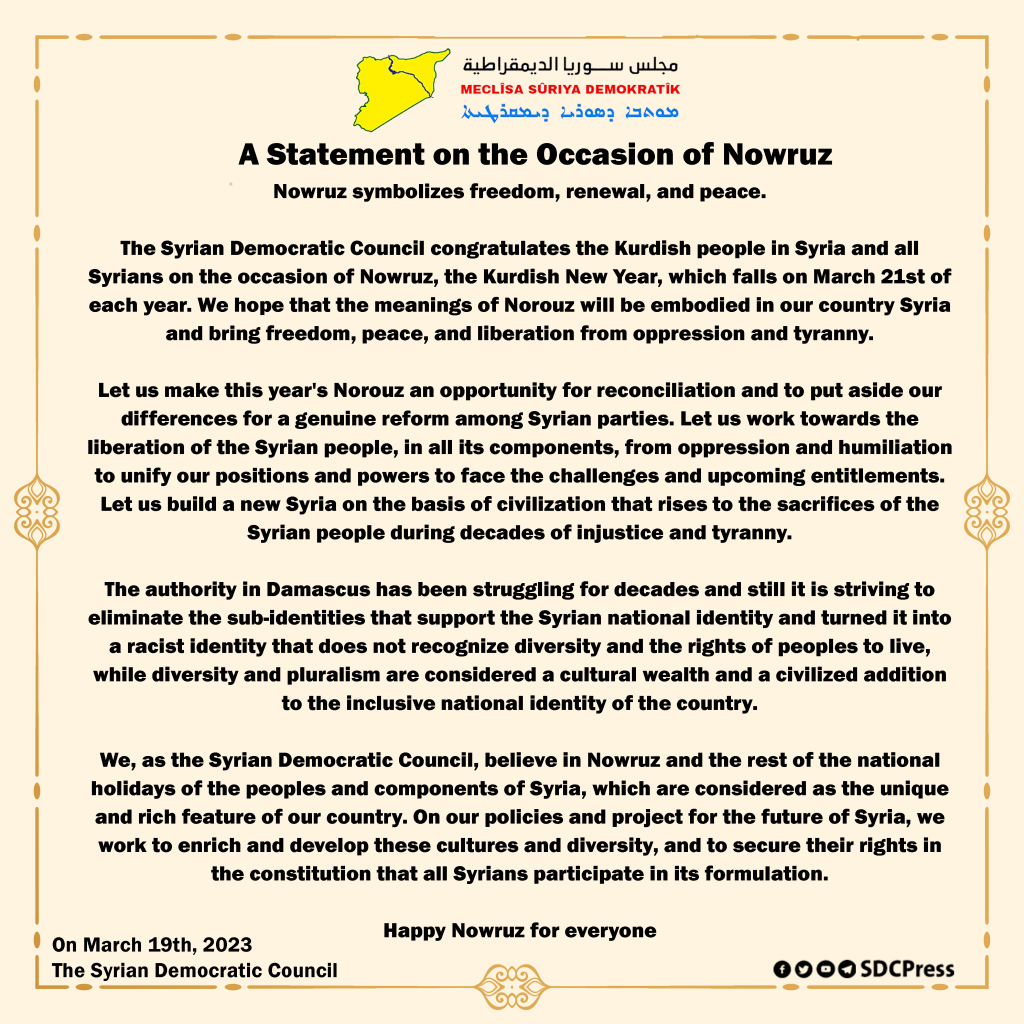 The Syrian Democratic Council congratulates the Kurdish people in Syria and all Syrians on the occasion of Nowruz, the Kurdish New Year, which falls on March 21st of each year. We hope that the meanings of Norouz will be embodied in our country Syria and bring freedom, peace, and liberation from oppression and tyranny.