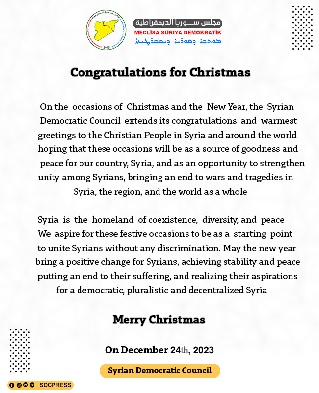 On the occasions of Christmas and the New Year, the Syrian Democratic Council extends its congratulations and warmest greetings to the Christian People in Syria and around the world, hoping that these occasions will be as a source of goodness and peace for our country, Syria, and as an opportunity to strengthen unity among Syrians, bringing an end to wars and tragedies in Syria, the region, and the world as a whole.