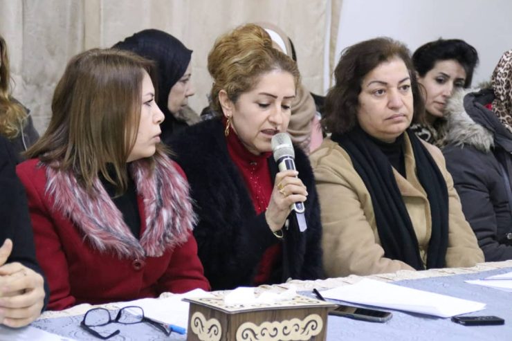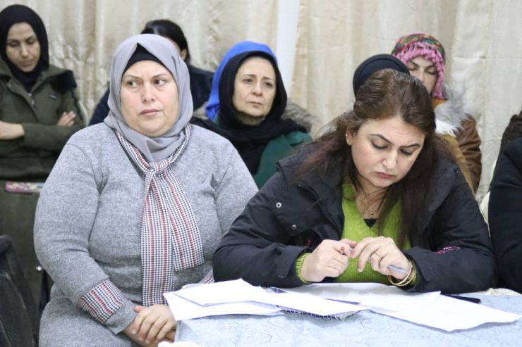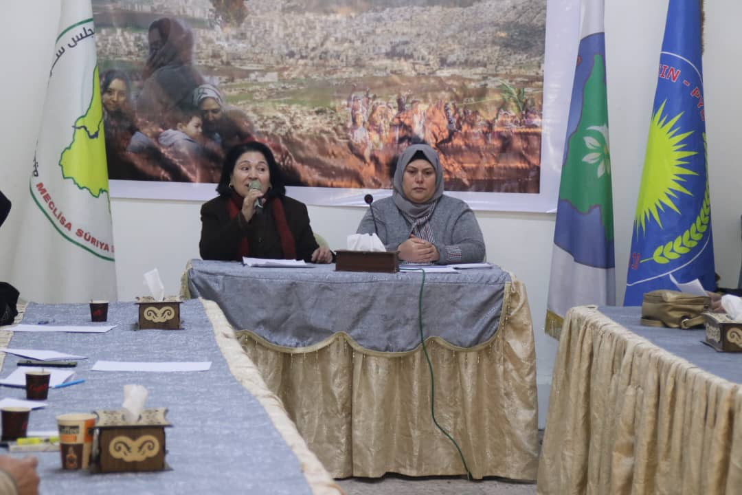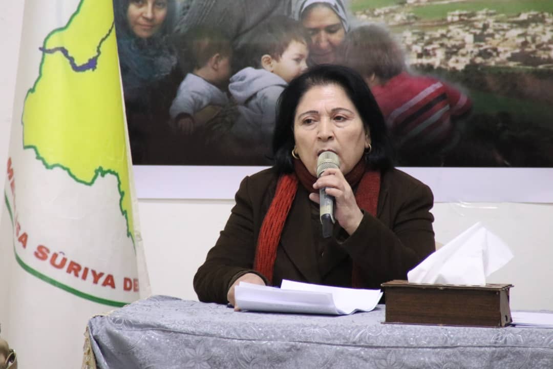 Zainab Qanbr, an administrator in the Women’s Bureau of the SDC in Aleppo, welcomed the attendees and spoke about the reality of the areas occupied by the Turkish state. She emphasized that Turkey, through its practices over the years, has imposed a new reality in the region.