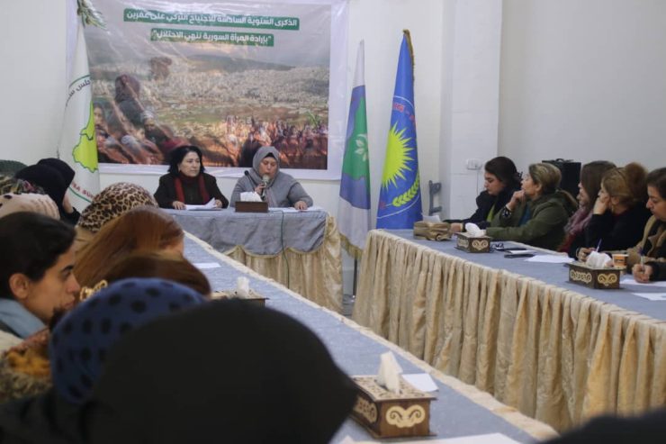 In turn, Hanan Kurdoush, the spokesperson for the Women’s Council in the Future Syria Party, called on international powers to pressure Turkey to withdraw from the occupied areas. She also called for holding accountable all those involved in crimes and violations against Syrian citizens, securing a safe return for displaced people to their homes, and reconstruction affected areas.