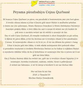 Bi boneya Cejna Qurbanê ya pîroz, em pîrozbahî û bextewarîyên xwe yên herî giran li tevahî cîhana îslamî û ji kur û keçên gelê me yê Sûriyê û malbatên şehîdan û hêzên me yên qehreman, Hêzên Sûriyeya Demokrat û Hêzên...