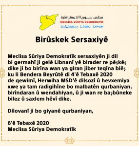 Meclisa Sûriya Demokratîk sersaxiyên ji dil bi germahî ji gelê Libnanî yê birader re pêşkêş dike ji bo birîna wan ya giran jiber teqîna biêş ku li Bendera Beyrûtê di 4’ê Tebaxê 2020 de qewimî, Herwiha...