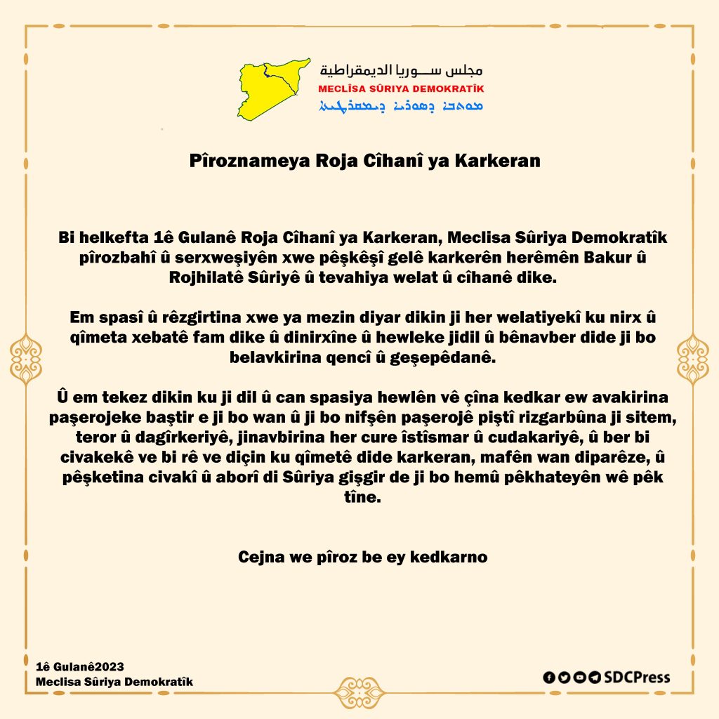 Bi helkefta 1ê Gulanê Roja Cîhanî ya Karkeran, Meclisa Sûriya Demokratîk pîrozbahî û serxweşiyên xwe pêşkêşî gelê karkerên herêmên Bakur û Rojhilatê Sûriyê û tevahiya welat û cîhanê dike.